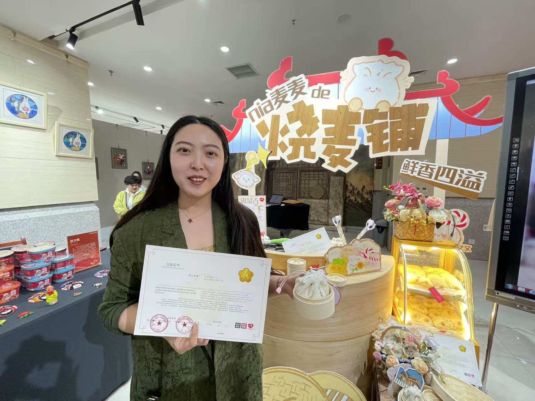 “咱家的烧麦皮用的是正经的巴盟雪花粉白面,特别劲道;羊肉馅儿采用的是锡盟的苏尼特羊肉,鲜嫩可口;再配上毕克齐产的大葱……拿好,您的烧麦出锅啦!”这份听起来就让人食指大动的解说,介绍的不是真正的餐品,而是以呼和浩特代表性美食烧麦为原型的文创产品“nia麦麦”。每售出一份“毛绒烧麦”,工作人员会模拟烧麦从制作到上桌的全流程,让每个顾客都能有着沉浸式的体验。
