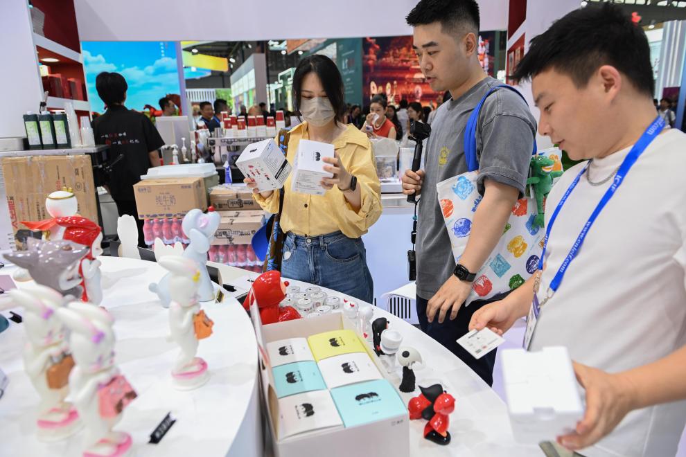 5月22日,观众在文博会重庆展区挑选盲盒产品。新华社记者肖恩楠摄