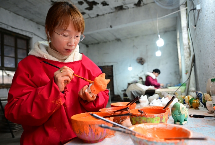 2025年3月11日,河南省洛阳市瀍河区白马寺镇金村的工艺品作坊内,民间艺人正专心致志地制作着唐三彩文创产品。近年来,当地政府积极推行“唐三彩+文旅+文创”的融合发展模式,有效带动了村民就业,所创作的唐三彩文创产品深受市场欢迎,畅销全国各地。李卫超摄(人民图片网)